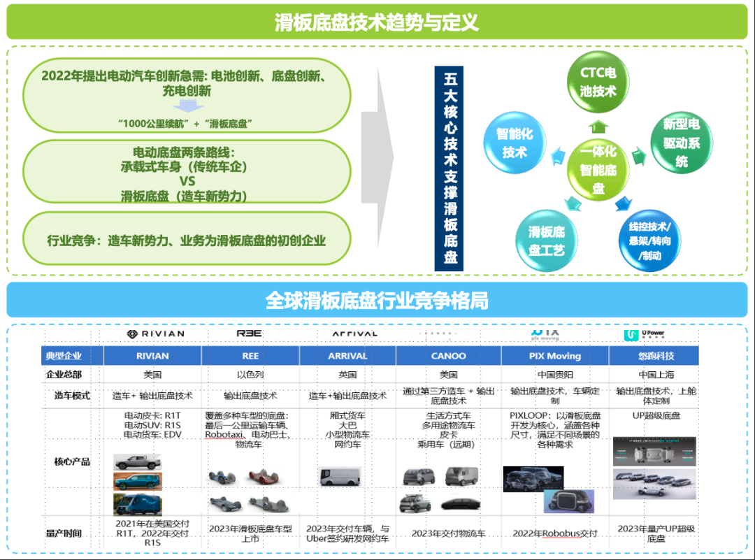 吉利汽车中央研究院资深总工程师吕健波指出:“在电动汽车创新急需电池、底盘、充电突破的背景下,由CTC电池技术、新型电驱动系统、线控技术(悬架/转向/制动)、滑板底盘工艺、智能化技术五大核心技术支撑的滑板底盘,作为电动底盘的创新路线,已吸引RIVIAN、REE等全球造车新势力和初创企业布局,它们在造车模式、核心产品和量产进展上各有特点,共同构成了全球滑板底盘的竞争格局。”