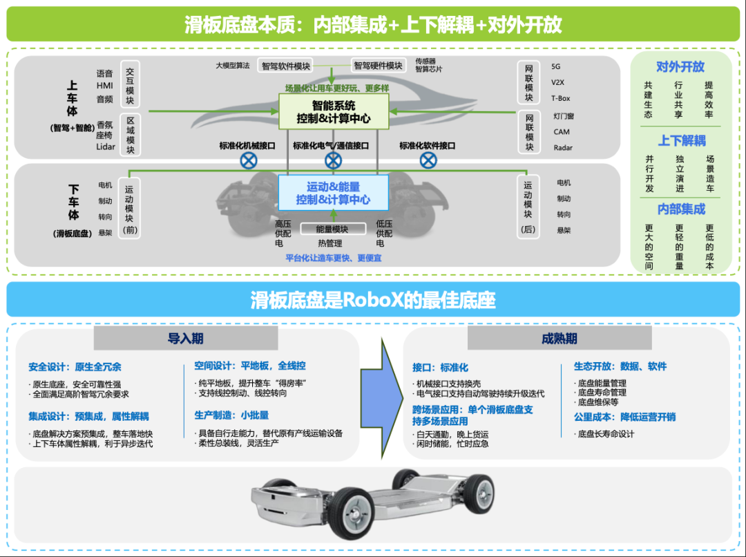 “滑板底盘凭借内部集成、上下解耦、对外开放的本质,在导入期就具备原生安全冗余、平地板全线控、预集成解耦和小批量灵活生产的特征,进入成熟期后更实现了接口标准化、生态开放化、跨场景应用及公里成本降低等优势。我们认为,滑板底盘是RoboX的最佳底座,能让造车更快更便宜,用车更好玩更多样。