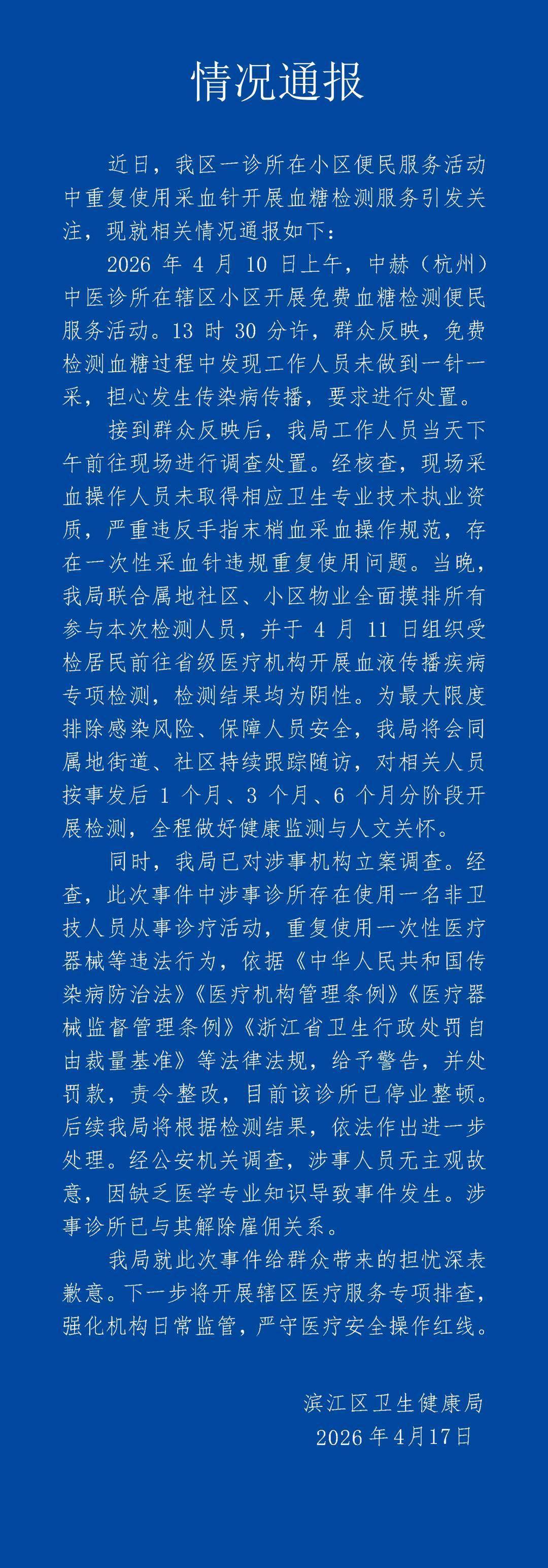 4月17日,杭州市滨江区卫健局就“诊所用一个针头给多人采血”事件发布通报。